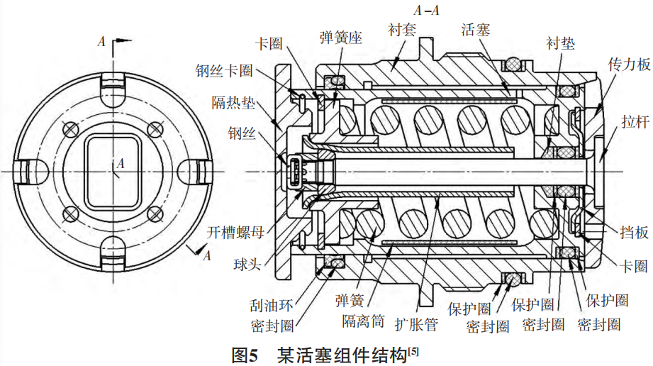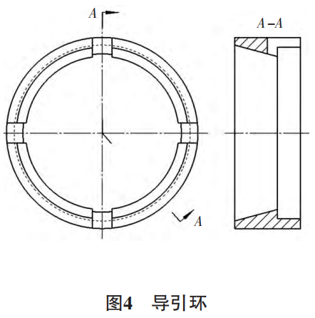 用于密封圈理順的挑針、套于螺紋上防止螺紋劃傷 密封圈的導(dǎo)套和保護(hù)圈校正的校正棒、收壓板、收壓套等 都屬密封件安裝的常用工裝,除此之外,一些設(shè)計(jì)上因結(jié) 構(gòu)受限而無(wú)法處理的槽或孔必須借助工裝來(lái)進(jìn)行彌補(bǔ), 否則密封圈的損傷無(wú)法消解。圖4所示為圖5某活塞組件結(jié)構(gòu)的輔助工裝實(shí)例,從中可以看出,如果不使用導(dǎo)引環(huán) 對(duì)襯套右端為了傳力板角向定位而銑掉的部分進(jìn)行補(bǔ) 形,在活塞壓入襯套時(shí),必然會(huì)成為活塞上的密封圈在該 位置鼓出的誘因,所以該活塞組件的傳力板、拉桿應(yīng)選在活塞壓入襯套之后安裝。同理,對(duì)閥套上不能開環(huán)形凹槽 過(guò)渡處理的交叉孔,也可以使用工藝柱銷進(jìn)行補(bǔ)形。