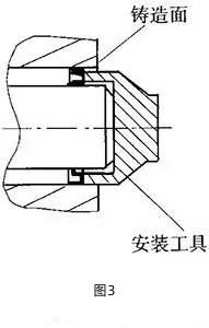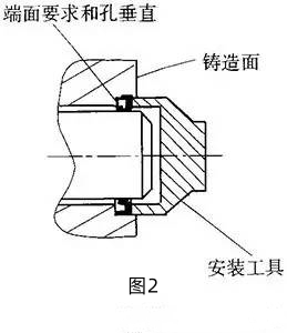 應設計專用的工位器具和專用工裝,確保油封密封處軸頸表面不被劃傷、油封唇口不損壞以及油封唇口安裝方向正確;在安裝過程中如油封唇口需通過螺紋、鍵槽、花鍵等時,應采取相應措施(如采用厚紙、膠布等蓋住螺紋表面)防止唇口損傷;如果唇邊鎖簧較松,可剪去10~15mm,將鎖簧首尾牢固相連,裝配時一定要用專用的壓套,輕輕壓進油封孔座,切不可敲打,更不準用錘子直接敲打油封;在不同的情況下,其安裝要求不同。在直孔且端面經(jīng)過加工的情況下,安裝工具須將油封壓至加工面(見圖1);在安裝孔帶臺階的情況下,安裝工具須將油封壓至臺階的端面(見圖2);在直孔且端面不加工的情況下,安裝工具必須將油封壓至軸的端面(見圖3)。