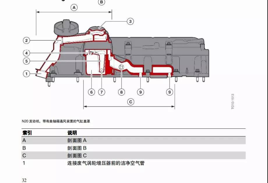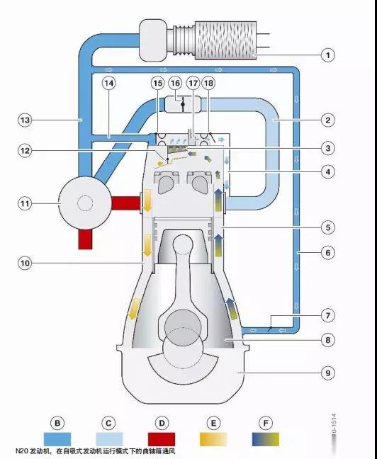 這是N20發(fā)動機的曲軸箱強制通風系統(tǒng)的工作路徑和原理。